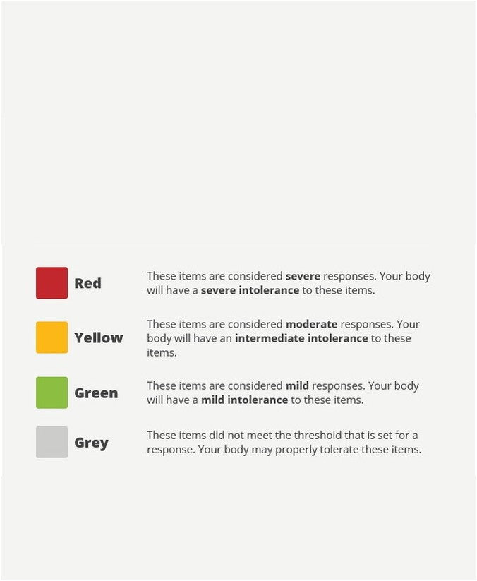 You’ll receive a detailed report identifying your food and environmental intolerances, categorized into three levels of severity (mild, moderate, and high). The results will guide you through an elimination plan for 6–8 weeks, helping your body heal and rebalance. Afterward, you can reintroduce items gradually to identify safe levels of consumption.