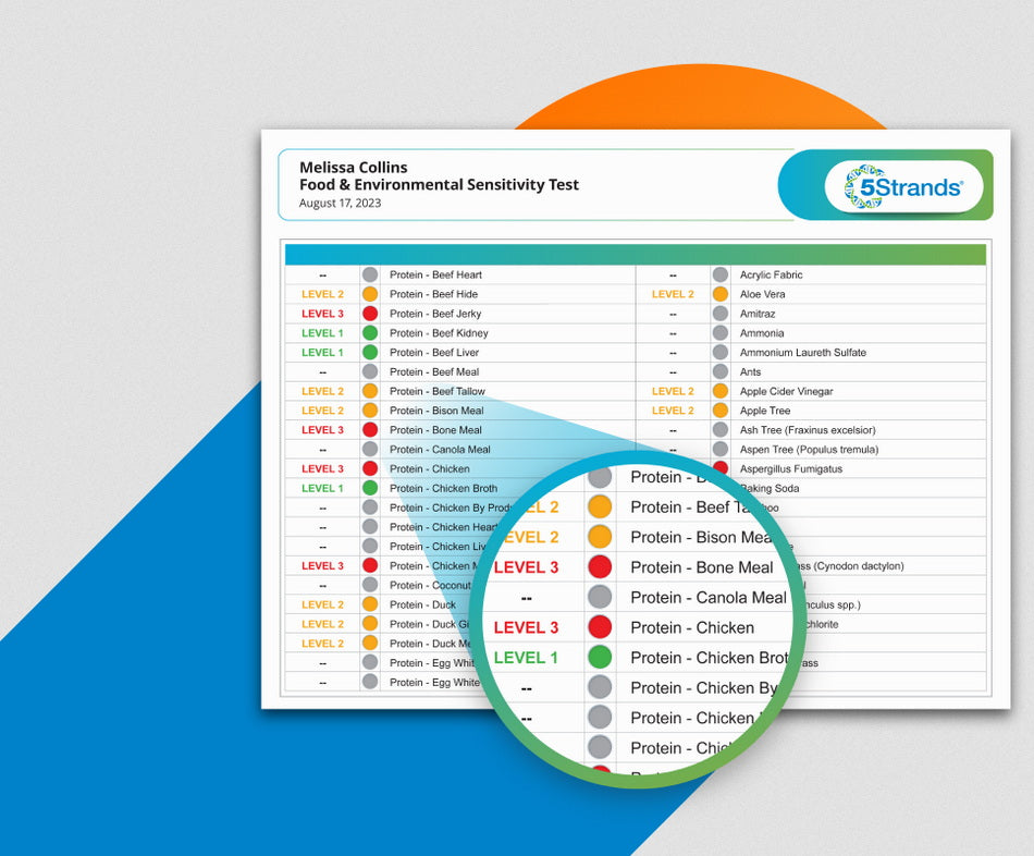 The 5Strands Food & Environmental Sensitivity Test analyzes how your body interacts with over 830+ items, providing valuable insights to improve your well-being. This comprehensive test includes: