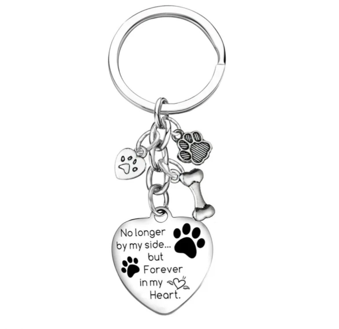 As a special bonus with your purchase, we'll also send a beautiful, memorial keychain with paw charms and a heart with the inscription, "No longer by my side, but Forever in my Heart.